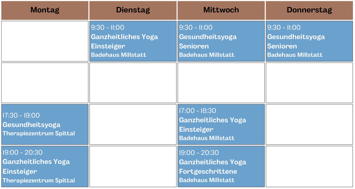 Der Yogakurs Kalender ist für Herbst 2025 und Frühjahr 2026 gültig. In den Ferienzeiten und an Feiertagen finden keine Kurse statt.